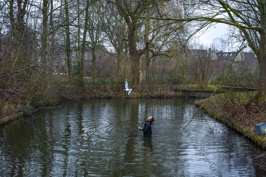 De brandweer kwam ter plaatste met twee wagens, waaronder een duikwagen. Hierin bevinden zich spullen om veilig het water in te gaan. Vanaf de kant zijn er twee takken afgezaagd waardoor de meeuw in het water terecht kwam. Hierna is door een brandweerduiker de meeuw gered.