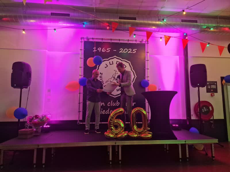 Tot slot bracht wethouder Jeroen Postma tijdens de feestavond een bezoek aan de judoclub om hen te feliciteren met dit jubileum en een cheque te overhandigen namens het college van burgemeester en wethouders, als blijk van waardering.