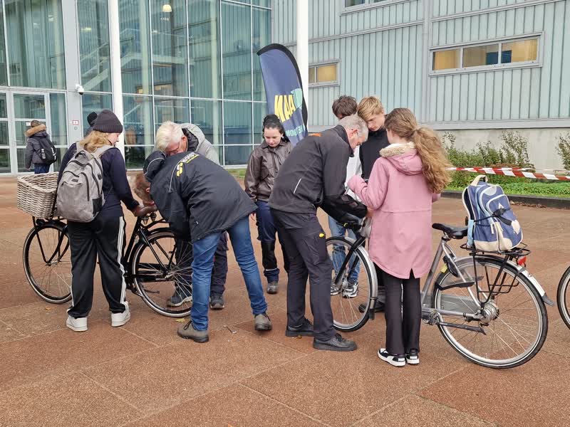 Goede fietsverlichting is letterlijk van levensbelang. Wie zonder licht fietst, wordt veel later gezien door automobilisten en andere weggebruikers. Uit onderzoek blijkt dat fietsers zonder verlichting een veel groter risico lopen op (bijna-)ongevallen. Een werkend lampje kan dus écht het verschil maken. Bij het Maerlant College in Brielle werden vandaag de leerlingen die op de fiets naar school kwamen gecontroleerd op hun verlichting. Als deze niet in orde was, konden zij dit vrijwillig laten repareren door leerlingen van het Praktijkcollege, met hulp van een echte fietsenmaker. Als dank kregen de leerlingen een kleine sleutelhanger mee.