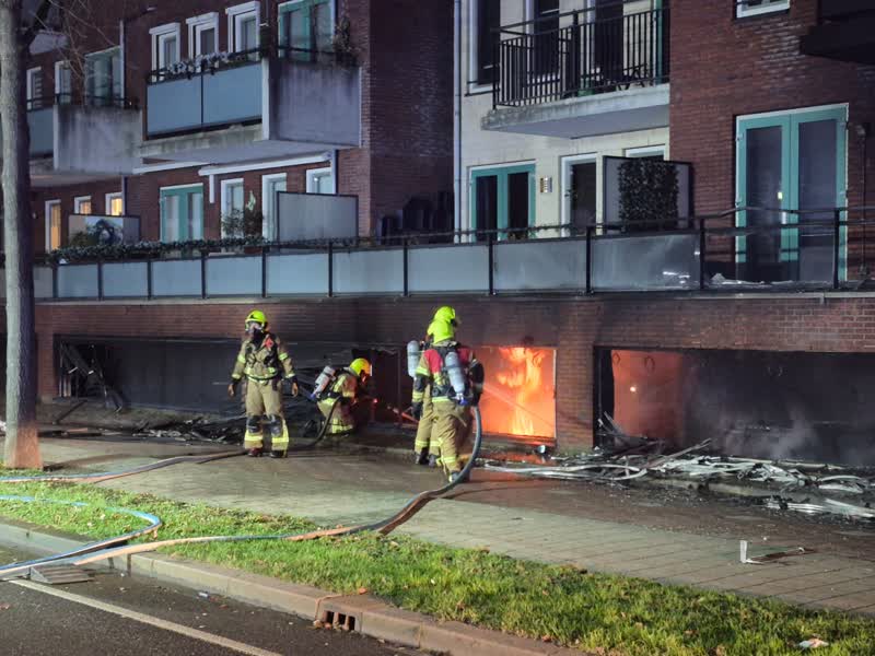 Er was vannacht brand uitgebroken in een parkeergarage onder een flatgebouw aan de Pluvierhof in Hellevoetsluis Foto: Jan Gerssen - LINQ Media