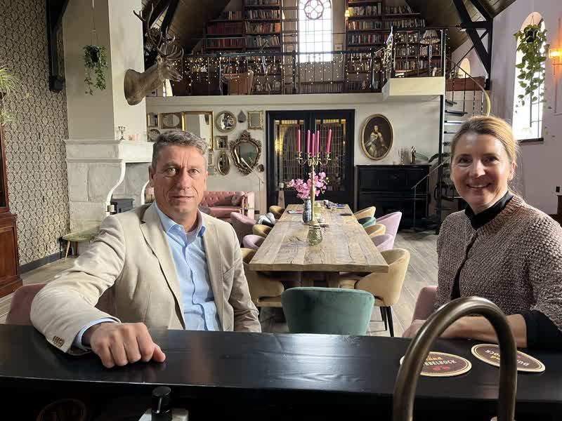 Naast de vergaderlocatie maakten Claudia en Peter aan de achterzijde van het gebouw een luxe B&B, met veranda en vrij uitzicht over de weilanden. ‘Toen we 2,5 jaar geleden openden, hadden we binnen twee uur de eerste boeking’, zegt Claudia. ‘We ontvangen gasten uit het hele land én uit België.’ Soms levert dat bijzondere momenten op. Zo herinnert Claudia zich een echtpaar dat hun 28-jarig huwelijk vierde. ‘Zonder hun vijf kinderen genoten ze drie dagen lang van champagne en dansten ze door de kerk. Dat vergeet ik nooit meer.’