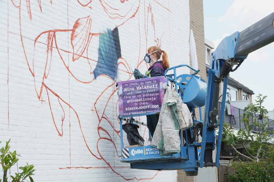 Spijkenisse – De wijk Waterland in Spijkenisse krijgt op dit moment in hoog tempo een nieuwe uitstraling door metershoge muurschilderingen die worden aangebracht door kunstenares Nina Valkhoff. Het project is tot stand gekomen door een samenwerking tussen de gemeente Nissewaard, Woonbron en Maasdelta.