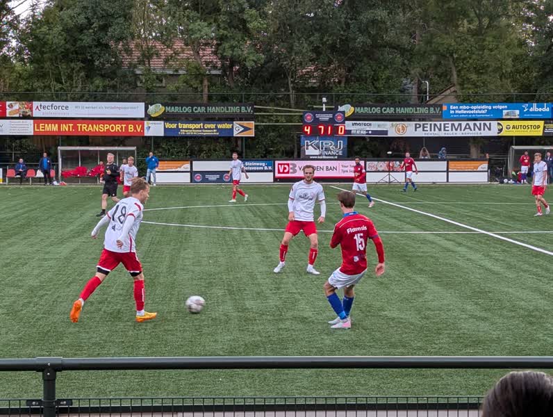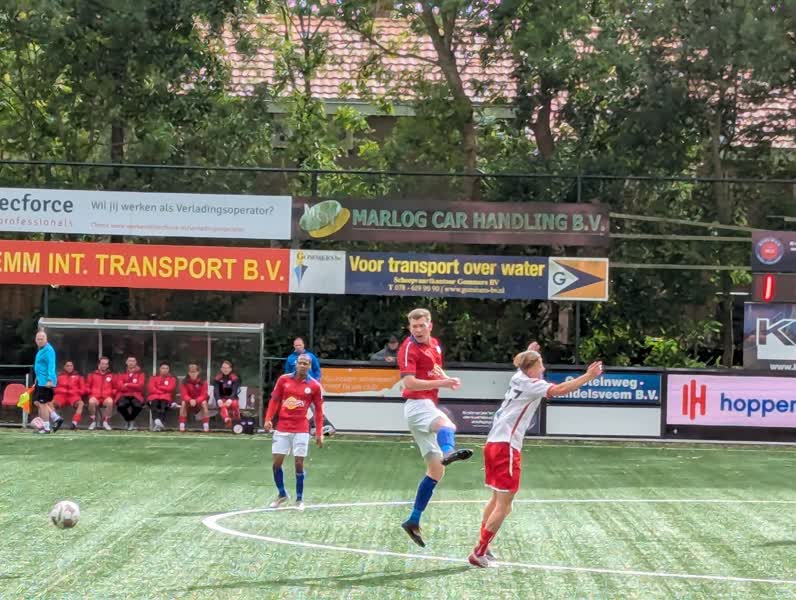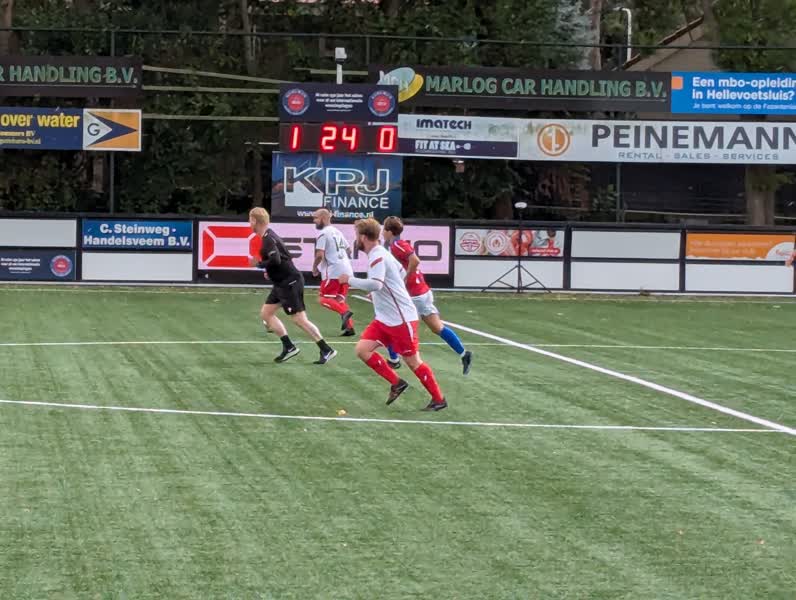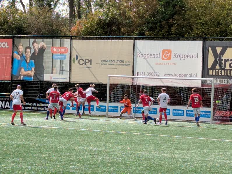 Hellevoetsluis profiteerde optimaal van het windvoordeel in de eerste helft. Al in de 10e minuut kopte Jeffrey Burger de 1-0 binnen. Een klein kwartier later was het opnieuw raak: Burger nam een vrije trap van zo’n 20 meter en joeg de bal met hulp van de wind onhoudbaar in de touwen – 2-0.